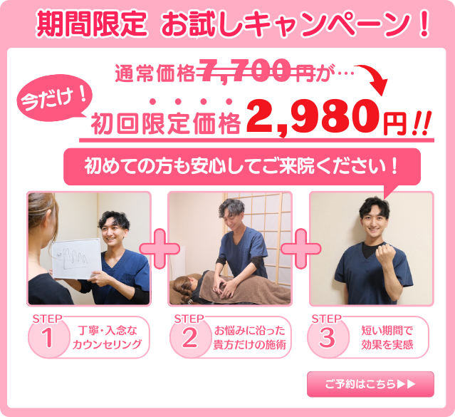 吉岡整体院では、徹底して技術を身につけた施術者が担当し、あなたの症状を最初から最後まで責任を持ってしっかりと向き合います。